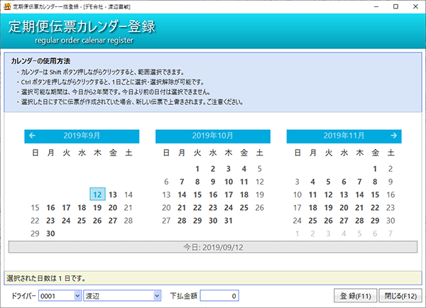 従来は、定期便登録で設定した曜日を基に、前々日深夜に伝票が作成されるのみでしたが、今回新たに追加されたカレンダー登録機能を使えば、年末年始やゴールデンウィークなど休日が多い月に、事前に見越して一月単位で伝票を作成しておくことが可能です。また伝票登録と同時にドライバーへの配車・下払金額の設定も可能になりました。
