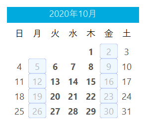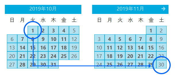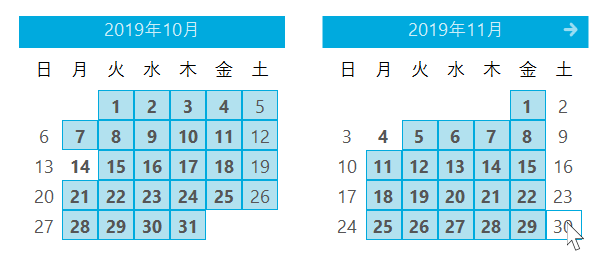 上の図の状態(10/1を選択)から SHIFTキーを押下したまま 11/30 をクリックを続ける