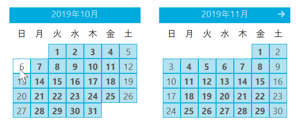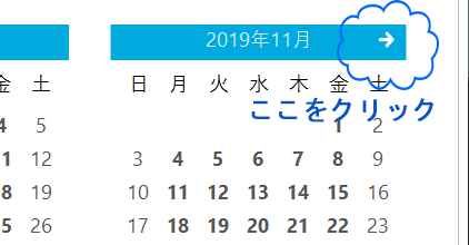 カレンダーの「月」表示エリアの左右の矢印をクリックすると、表示された月を前後にスライドできます。