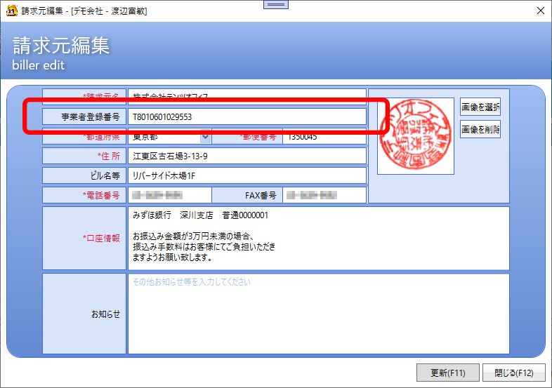 請求元編集画面に「事業者登録番号」の設定欄を追加した