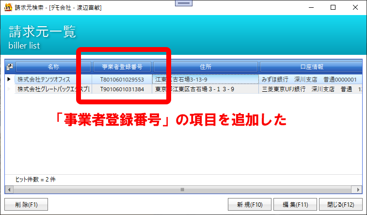 請求元検索画面に「事業者登録番号」の設定欄を追加した