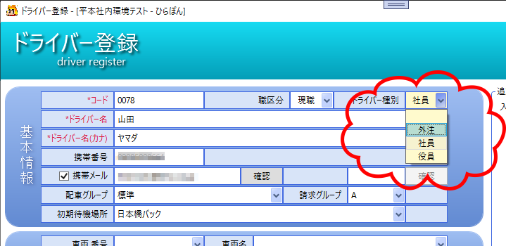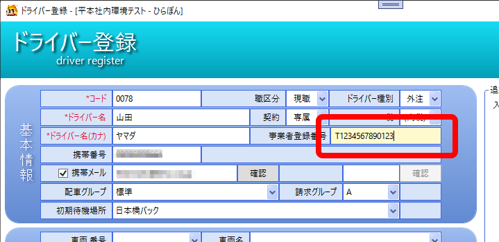 ドライバー種別を「外注」にすると「事業者登録番号」設定欄が表示されます。