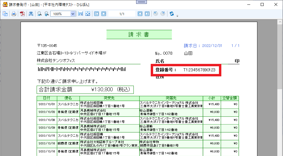 ドライバーマスタに事業者登録番号が設定されてない場合、従来どおりの請求書になります。