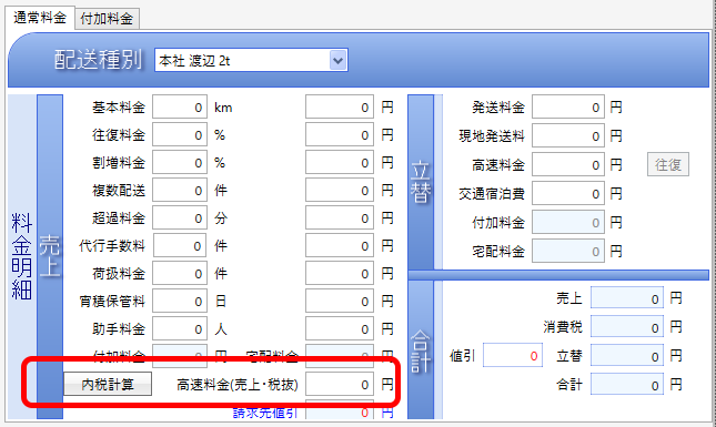 伝票登録画面、伝票修正/確定画面等の料金欄に「内税計算」のボタンが追加されました。このボタンをクリックすると「高速料金の内税計算」画面が起動します。