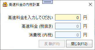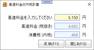 高速料金を課税額に含める場合、消費税を抜いた金額で計上するケースが多いと思います。そこで税抜き金額を算出する機能が新たに追加されました。