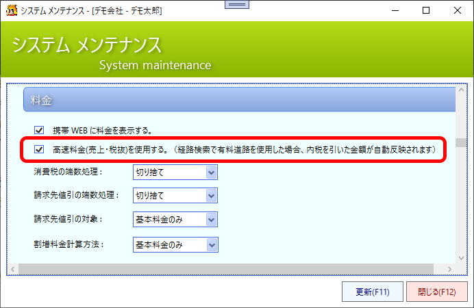 システムメンテナンスの設定により、伝票画面でルート検索した際の高速料金設定を「立替」の「高速料金」から「売上」の高速料金(売上・税抜)に変更することも可能です。