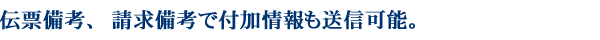 伝票備考はドライバーに伝達されますので、例えば「内線:123で呼出し。 担当:関口様」などの付加情報を配送情報と一緒に送信できます。請求備考の場合は、「配送遅延の為、10%割引」などを請求書に印字することができます。